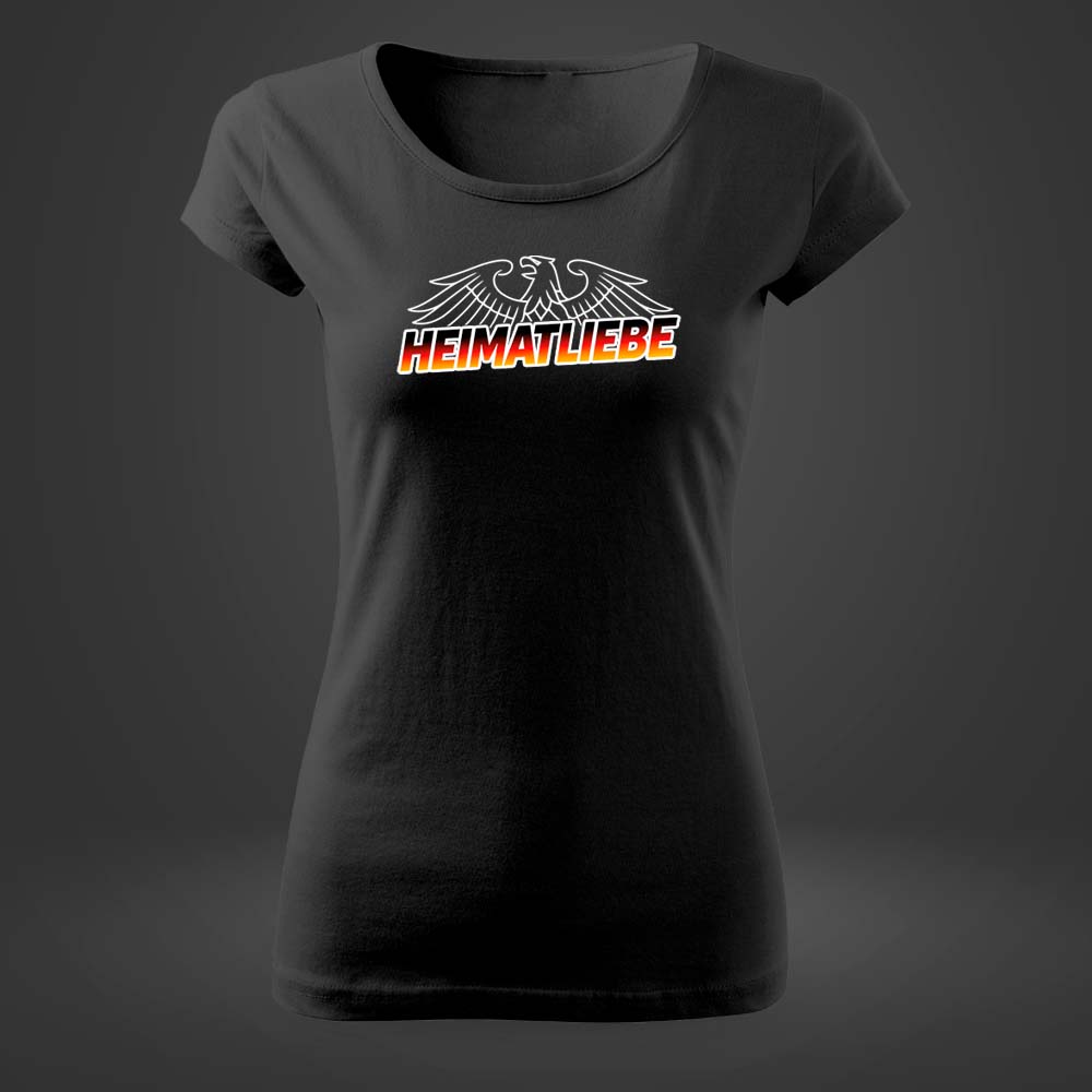 Wer ein HEIMATLIEBE Damen T-Shirt, ein schwarzes Damen Shirt oder ein Damen T-Shirt mit Adler Motiv sucht, bekommt hier ein Modell mit klarer Linie und markanter Wirkung.